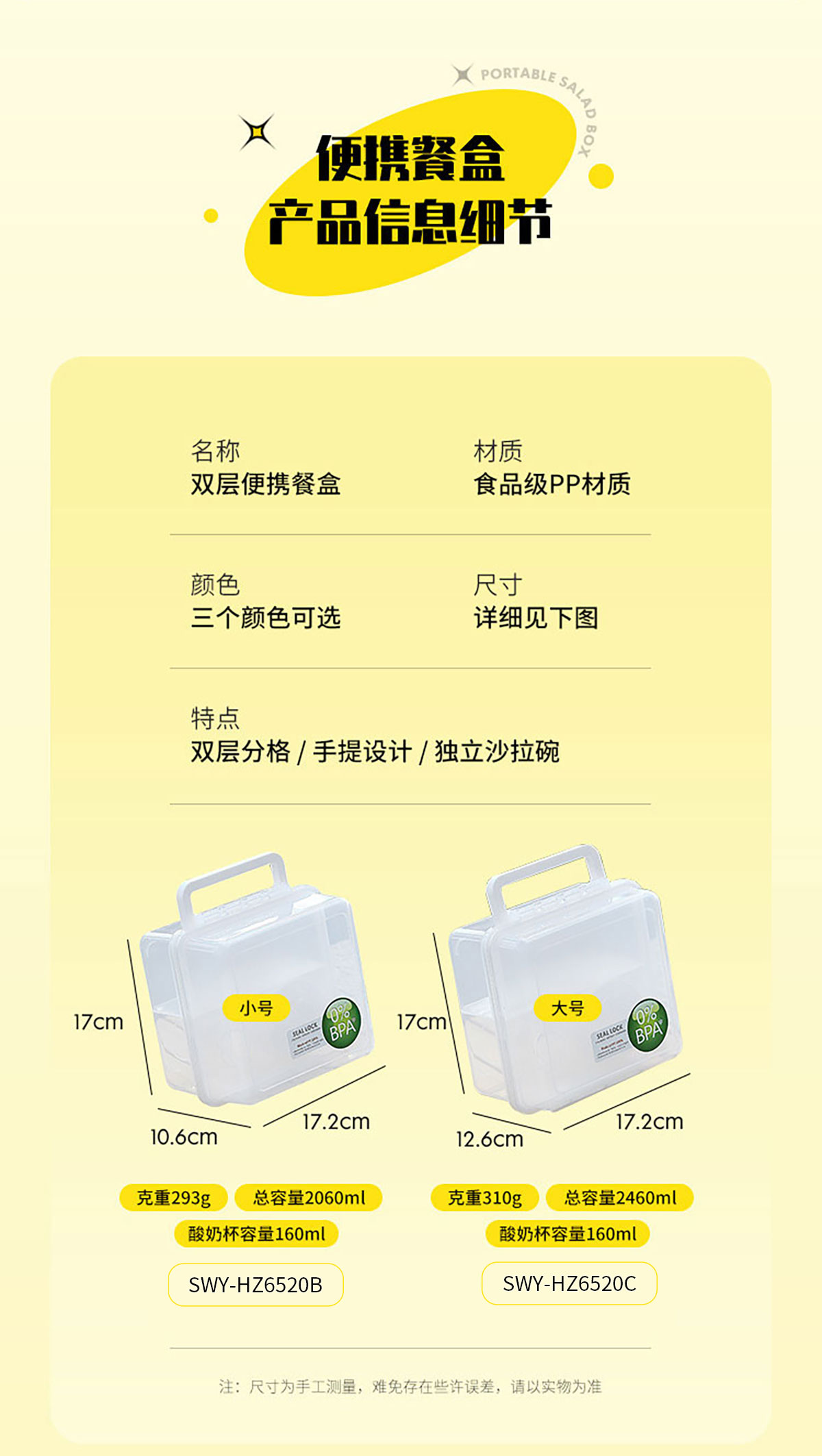 Size: SWY-HZ6520B:172*170*106mm/2060ml SWY-HZ6520C:172*170*126mm/2460ml