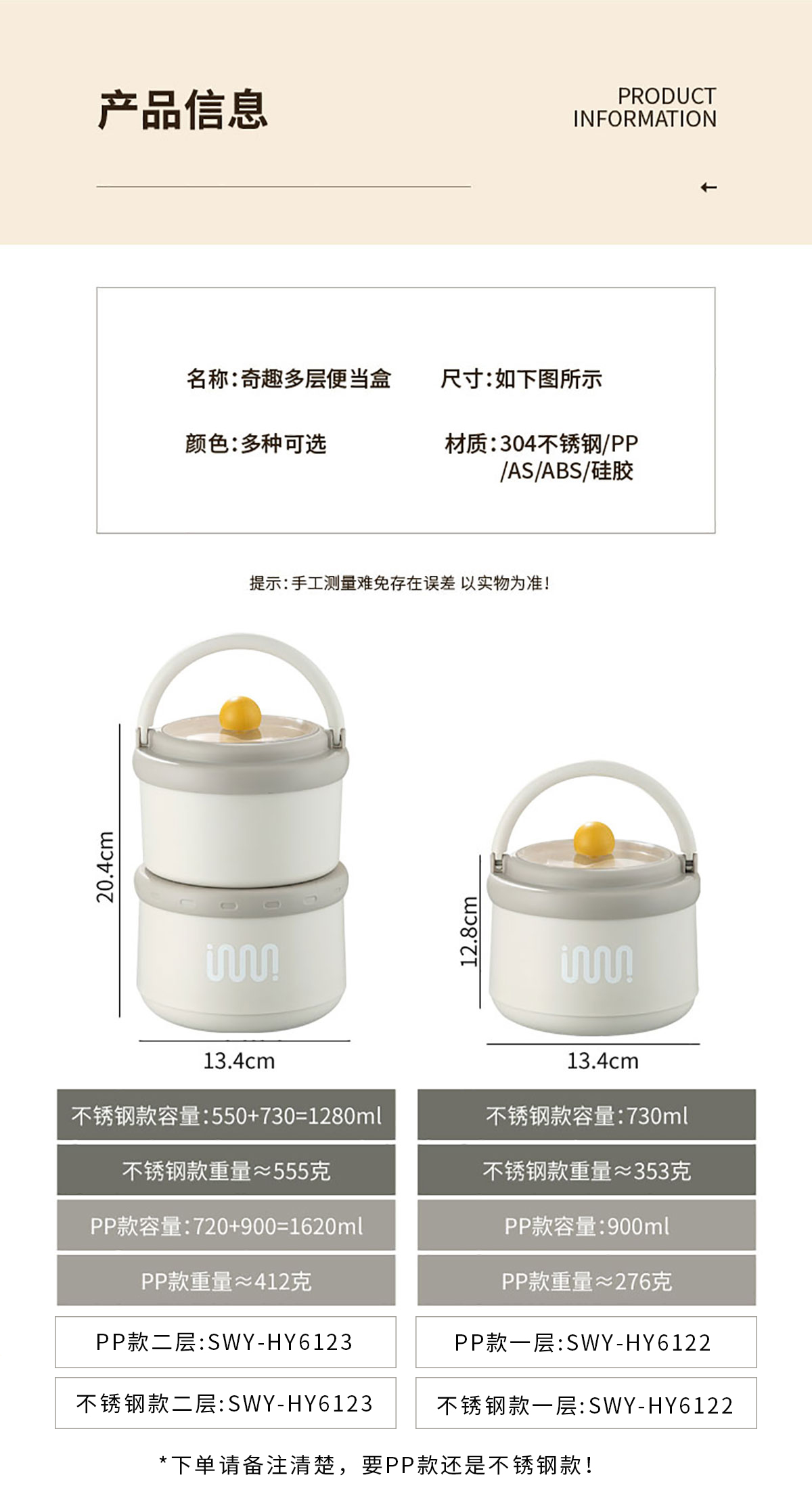 SWY-HY6123(二層不銹鋼款):Φ134*204mm/550ml+730ml=1280ml