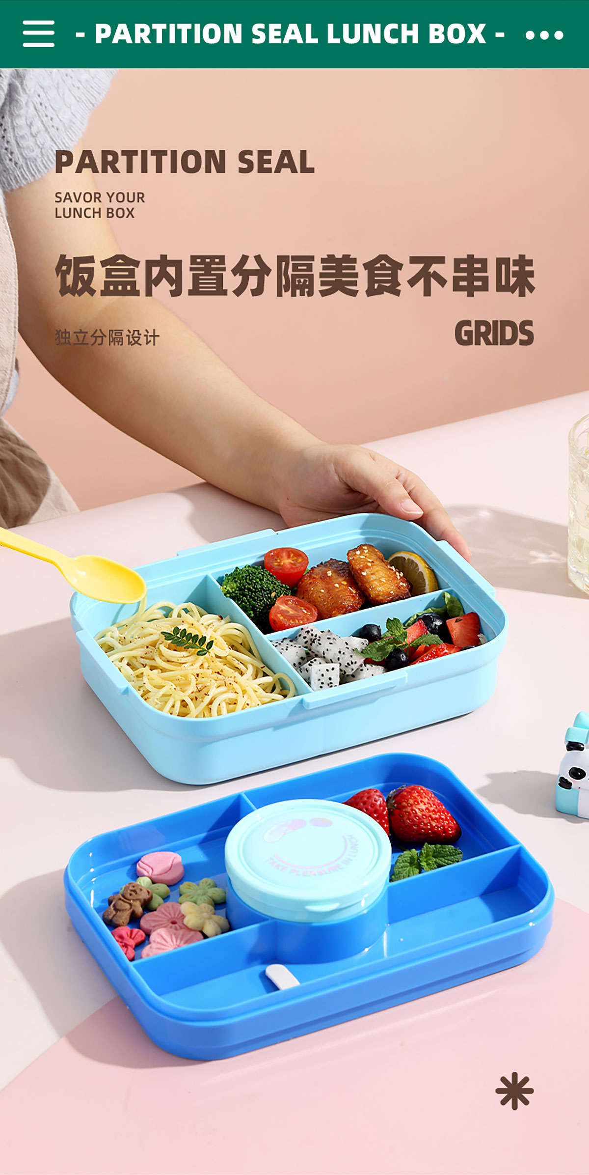 相機(jī)不串味餐盒(長(zhǎng)方形塑料三格1270ml+碗150ml+PP勺)