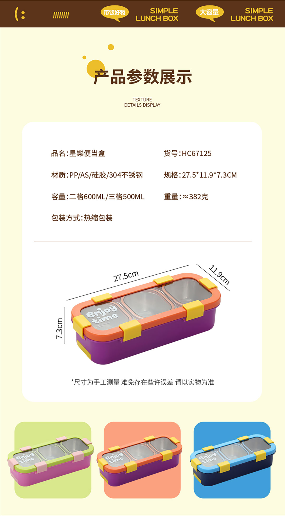 Size: 275*119*73mm(二格600ml/三格500ml)